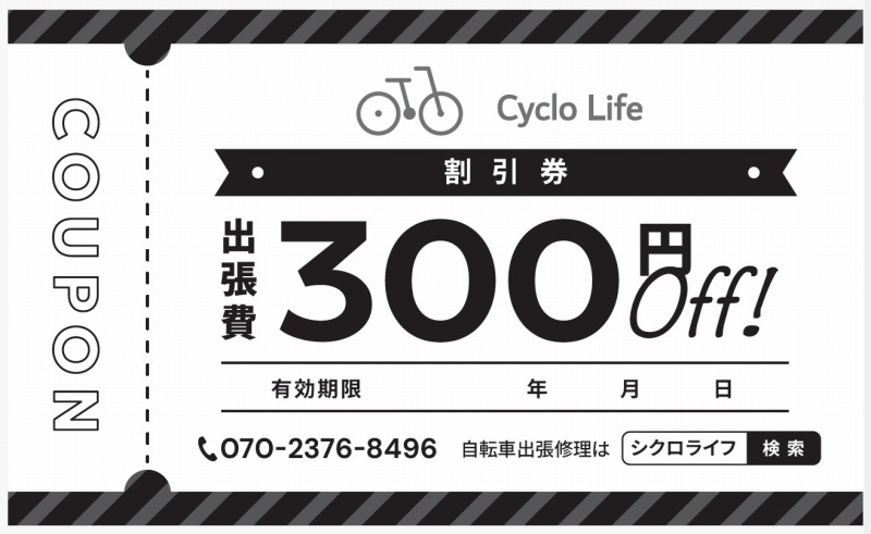 2025年12月末まで開業記念として、出張費を300円割引いたします。