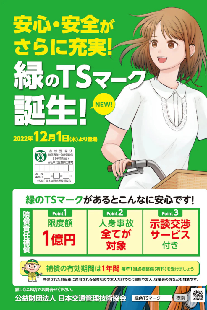 自転車安全整備店に登録が完了し、TSマーク(緑)の取り扱いが可能になりました。
