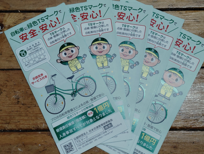 自転車安全整備店での点検を行うことが加入の前提で、当店(シクロライフ)では「安全点検・整備」¥2,200- にTSマーク代 ¥800- 合計¥3,000- で一年間の安心をまかなえます。