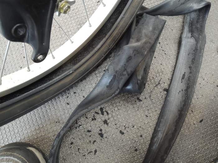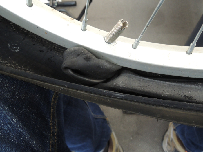 よく見る光景ですが、パンク後に自転車を引きずったことでチューブがぐちゃぐちゃに折り畳まれてしまっています。